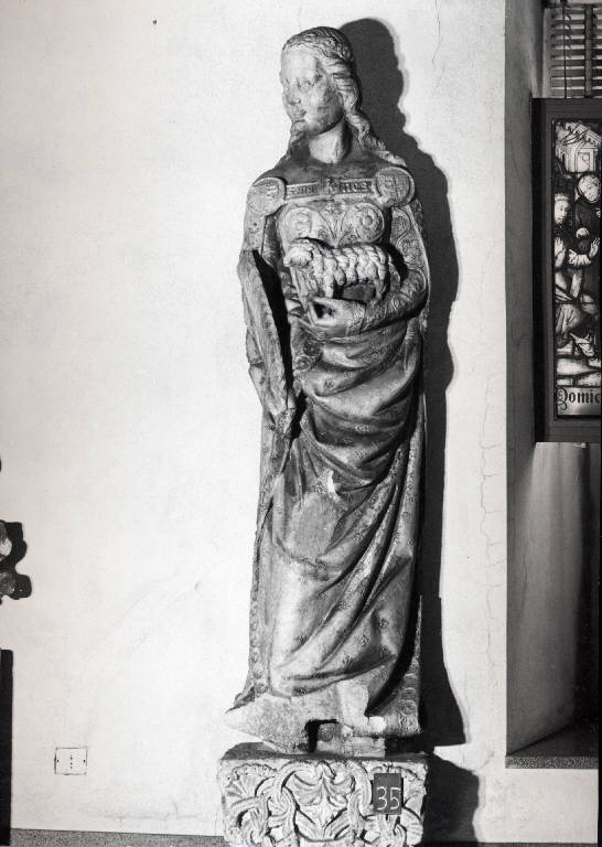 La figura si connota con glia attributi classici di S. Agnese. La santa ha il viso rivolto verso sinistra, i capelli ricadono statici sulle spalle lavorati ad ampi boccoli. Sono evidenti le particolarità fisiognomiche negli occhi sporgenti e rotondi e la bocca carnosa. La santa sostiene sull'avambraccio sinistro l'agnello, il cui vello è lavorato ad ampie ciocche di andamento regolare che rendono l'animale parte integrante del compiacimento descrittivo e calligrafico che caratterizza la figura della santa. Nella complessa realizzazione dell'abito della santa sono visibili motivi decorativi che trasmutano l'intenzione di mimesi e l'attenzione al dettaglio suntuario diviene un motivo che prende il sopravvento sulla definizione della veste che asseconda il fitto ricamo che riporta motivi floreali, tralci di vite e girali di acanto. La parte inferiore dell'abito è frammentato da pieghe a spigolo vivo che non accompagnano l'anatomia sottostante, ma esaltano il virtuosismo con il quale è stato realizzato l'abito. La figura ha le spalle coperte da un prezioso mantello che porta le insegne di casa Visconti e che copre parzialmente le spalle della santa. Il bordo del mantello è decorato con un motivo a rosette, ripreso dall'abito.