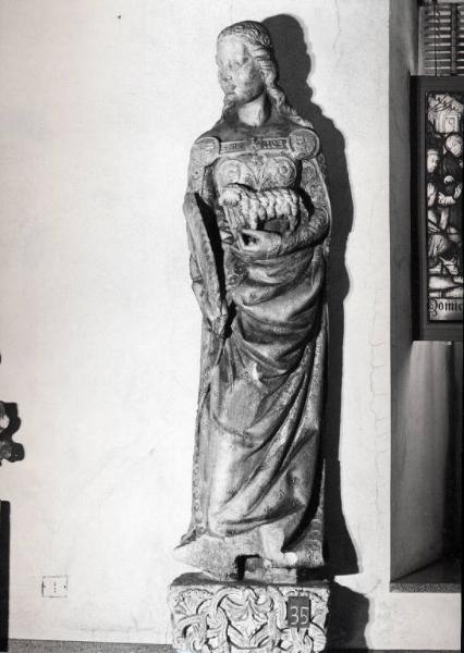 - NOTIZIE STORICO CRITICHE Si ritiene di appoggiare la tesi di Ursula Schadler che propone confronti puntuali e convincenti, per quanto riguarda la formazione e la provenienza geografica del maestro artefice della S. Agnese, che deve aver visitato la bottega dei Parler e presenziato nei cantieri di Praga e Vienna. Secondo le argomentazioni proposte dalla studiosa la data di esecuzione si collocherebbe tra l'ultimo decennio del Trecento e i primi del Quattrocento, legando la statua al cantiere del Duomo, interessante è lo spunto di tentare l'identificazione della Santa con una dama di casa Visconti, a tal proposito si potrebbero proporre altri nomi oltre a quello menzionato dalla Schadler, anche se per tutti rimangono alcune riserve. \nLa studiosa propone il confronto con la vicenda della cugina di Gian Galeazo Visconti, Agnese, sposa di Francesco Gonzaga, morta nel 1391, uccisa dal marito che la accusava di adulterio. \nLe decorazioni araldiche della casa di Francia, già notate da Ugo Nebbia, potrebbero dare adito a cercare la realizzazione della S. Agnese, nella sfortunata a romanzesca vicenda di Valentina Visconti, figlia del duca e sposa di Luigi di Orleans . Valentina fu condotta a Parigi dopo la nascita di Galeazzo Maria, erede di Giangaleazzo, e morì nel 1408. La principessa fu protagonista involontaria delle vicende di palazzo della Guerra dei Cent'anni. In questa ipotesi va considerato che la faida francese tra Isabella di Baviera, e Valentina di Orleans, è da far risalire a dopo il 1392, quando la moglie di Carlo di Borgogna, minò la figura della cugina. Questa tesi privilegerebbe l'insegna francese al nome della santa, legato comunque alla committenza Visconti, in quanto protettrice del casato.\nResta la certezza che S. Agnese era la protettrice della famiglia Visconti. A questo punto è bene notare come a fianco degli stemmi araldici fin qui osservati dalla critica, riferiti oltre che al casato Visconti anche agli Orleans, vi sia la croce sabauda nello scudo di sinistra. Inoltre per collocare la figura prima del 1395 può essere di supporto notare che lo scudo visconteo, è partito, con lo stemma sabaudo e il giglio di Francia, non è inquartato con l'aquila imperiale, questo particolare potrebbe riportare la statua ad un momento precedente alla nomina ducale. La presenza dell'aquila potrebbe essere spiegabile con l'autorizzazione imperiale di esporre il simbolo già in uso dai tempi di Azzone, che ottenne il vicariato. Per lo stemma Visconti con la croce sabauda possiamo ricordare la figura di Bianca di Savoia, madre di Giangaleazzo. Il conte di Virtù poteva inoltre foggiarsi dei gigli di Francia dopo il matrimonio con Isabella di Valois nel 1360 (P. Mezzanotte, G. Bascapè, Milano nell'arte e nella storia, Milano, 1948, p. 148.). \nUn ulteriore dettaglio utile a stabilire un ambito di riferimento per la nostra statua potrebbe essere l'attenzione, di cui si è già detto, per i particolari di arte suntuaria. Il particolare abito della santa, con l'ampia scollatura che lasci intravedere le spalle e la manica stretta che si allarga dal polsino fino alla mano, è un abito che si rintraccia in immagini di miniatura lombarda tra gli anni settanta e ottanta del Trecento. Anche i dettagli di costume riportano quindi la statua in un periodo antecedente la nomina ducale, se non alla fondazione del Duomo. Un paragone ancora più calzante potrebbe essere la statua rappresentante Caterina d'Austria, in collezione privata a Vienna, pubblicata dalla Schadler, che riporta dettagli di costume, nonché stilistici, affini alla S. Agnese, la statua è datata al 1370 circa. Un confronto tra Valentina che riceve un codice da Onorato Bonet, che riporta un abito non dissimile da quello indossato dalla S. Agnese, immagine contenuta in un codice della Biblioteca Nazionale di Francia (ms. fr. 811), dimostra come dettagli di costume della santa siano collocabili non oltre l'ottavo e il nono decennio del XIV secolo.\nSarebbe utile appurare l'originale destinazione della statua che, per le caratteristiche scalpellature sul retro, non sembra fosse inizialmente destinata alla posizione da cui fu rimossa dopo i bombardamenti della seconda guerra mondiale. Anche le dimensioni della statua non sono coerenti con altri esempi di decorazione esterna del Duomo, è possibile che si tratti di una statua destinata all'interno, o addirittura proveniente da una altro contesto di interesse visconteo, trasferita sul Duomo forse in seguito ad intenti devozionali e celebrativi che si riferiscono inequivocabilmente a alla figura di Giangaleazzo, sia per la ripetizione degli stemmi che si riferiscono alle unioni dinastiche più vicine a lui, sia la provenienza boema della statua che riporta ai legami del futuro duca di Milano con l'imperatore Venceslao.