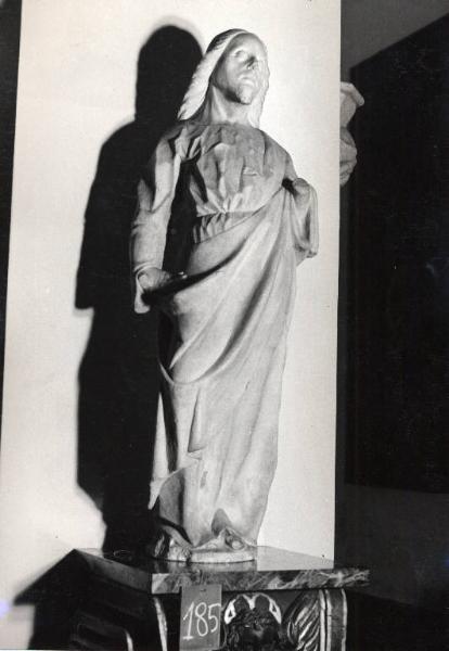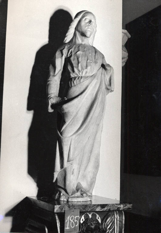 - NOTIZIE STORICO CRITICHE La statuetta del Museo del Duomo presenta interessanti spunti. Il volto offre anticipazioni di alta qualità degli esiti della scultura degli anni novanta del quattrocento. Il modellato è delicato e i trapassi luministici sono accompagnati dalla superficie arrotondata. L'aria trasognata, che aveva fatto pensare alla figura rappresentata come un Redentore, sembra essere annuncio delle vaghe fisionomie di alcune figure bramantinesche (Noli me tangere, Milano, Pinacoteca di Brera, già S. Maria del Giardino, 1507, o il Cristo del Museo Thyssen-Bornemisza, Madrid, 1490 cca.). Ulteriori assonanze, si hanno con alcune statue presenti nella decorazione di Tommaso Rodari sul Duomo di Como, il riferimento va particolarmente al Cristo risorto, databile agli anni novanta del secolo. Per quanto il differente stato di conservazione permetta solo di riscontrare un'assonanza e una comune sensibilità di matrice mantegazziana, si nota come nel caso di Como questi elementi siano risolti con un accentuarsi dell'espressività, mentre nel nostro caso con uno sviluppo delle forme ovalizzanti (Foto pubblicata in S. Soldini, Tommaso Rodari, contemporaneo e seguace dell'Amadeo, in Giovanni Antonio Amadeo. Scultura e architettura del suo tempo, a c. di J. Schell, L. Castelfranchi, Milano, 1993, pp. 505-523, p. 521 ). Da rileggere in questo senso la menzione che Silvio Vigezzi fece nel suo catalogo del nome di Cristoforo Solari, ovvero come la grande abilità di questo anonimo maestro di giungere ad esiti di tanta fortuna nei decenni successivi agli anni ottanta (forse uno dei riferimenti più immediati, per tipologia più che per una reale corrispondenza di sensibilità, è il Cristo morto del Dayton Art Institute attribuito al Gobbo). \nPiù difficile riportare agli ultimi decenni del secolo il resto della figura ancora ammantata del panneggio cartaceo, per quanto addolcito nelle increspature e smorzato dalla fascia trasversale che evidenzia il ginocchio, per il quale sembra più opportuno un confronto con il Monumento della Torre (1583) in S. Maria delle Grazie, dove istanze che aprono il nuovo secolo sono fuse con modi e sensibilità del periodo immediatamente trascorso. \nSingolare e ben riuscita commistione di suggestioni, si ritiene opportuno affidare la statuetta ad un maestro lombardo attivo dalla metà del secolo che abbia forse condotto un periodo di apprendistato vicino alla cerchia amadeiana, si propone in questa sede una datazione tra gli anni ottanta e non oltre l'ultimo decennio del Secolo. \nUn ulteriore dato da prendere in esame è il particolare stato di conservazione della superficie lapidea. Fatta esclusione della perdita delle parti più esposte della figura, la scultura presenta un buono stato di conservazione con una cromia dorata e l'assenza di depositi. Questa caratteristica fa pensare che la prima destinazione questa statuetta fosse un altare o un monumento che non ebbe lungo corso all'interno del Duomo, ma che per l'alta qualità della statua e, anche in base al grado di dettaglio e finitezza, potesse essere stata conservata nei locali della Fabbrica, una volta dismessa dal suo contesto originale, forse uno degli altari fatti togliere da Carlo Borromeo, dopo il 1566.