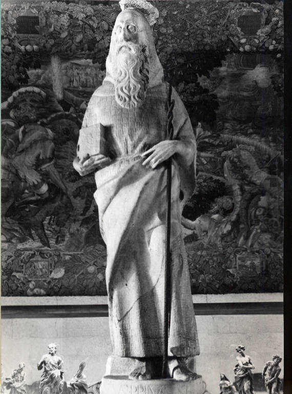 Figura maschile velata con barba lunga e aureola. In vista porta una cintura che stringe le vesti. nella mano destra tiene un libro chiuso. Nel braccio sinistro è infiòlato un bastone in ferro.\nSul retro: non vi è alcuna definizione formale, ma la superficie è quasi piatta e presenta i segni della sbozzatura. \nal centro del busto è inserito, in un piccolo alloggiamento, il gancio d'ancoraggio in ferro saldato al marmo con piombo \nsi notano gli ampi inserti di cemento (?) che saldano le parte originarie staccatesi