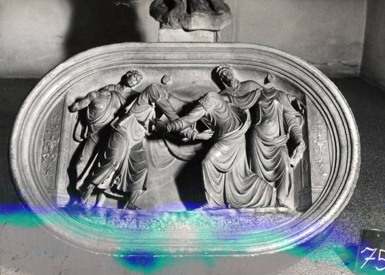 L'altorilievo rapresenta 6 figure stanti di cui 4 sono acefale, abbigliate con abiti classicheggianti.