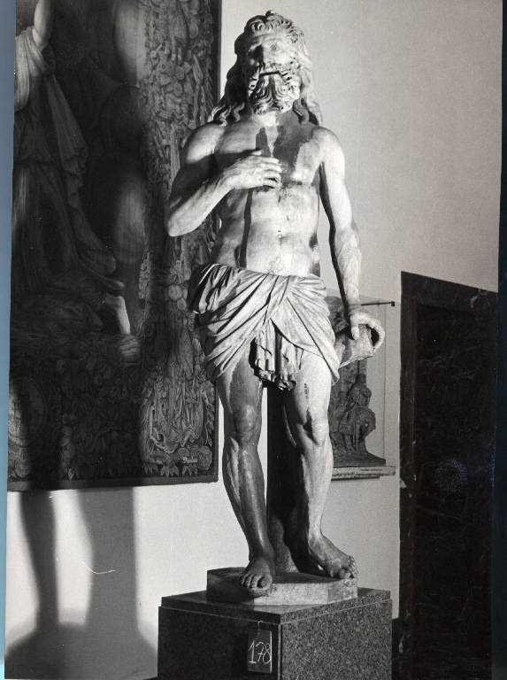 Figura maschile stante con barba e capelli lunghi. indossa un perizoma. La mano destra è appoggiata al petto, la mano sinistra su un tronco posizionato dietro la gamba sinistra.\nSulla base ottagonale irregolare per il suo adattamento alla mensola in parete, sul retro: l'opera si presenta finita eccetto nel tronco la cui superficie quasi piatta, presenta i segni della punta usata per la sbozzatura.