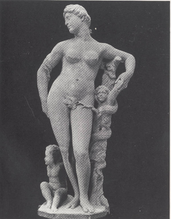 Figura femminile stante nuda, la zona genitale coperta da una foglia di vite. Ha con capelli lunghi, una ciocca le ricade sul braccio destro. il braccio sinistro è appoggiato ad un tronco su cui è avviluppato un serpente.la testa è girata verso destra. in basso accanto alla gamba destra vi è la figura di infante nudo.\nSul retro: l'opera si presenta finita