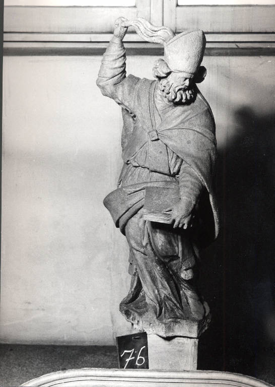 Figura maschile stante barbuta. Indossa abiti vescovili. Il braccio destro è alzato e la mano sostiene uno staffile. Con la sinistra sostiene un libro chiuso.\nsul retro: l'opera si presenta finita all'altezza della vita è inserito, in un piccolo alloggiamento, il gancio d'ancoraggio ad uncino, in ferro, saldato al marmo con piombo.