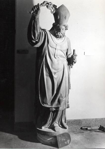 Figura maschile barbuta in abiti vescovili. il braccio destro è alzato e nella mano strige uno staffile. Nella mano sinistra sostiene un crocefisso mutio.\nsul retro: L'opera si presenta finita, anche se si possono ancora rilevare sotto il bordo della pianeta i segni del trapano e nella parte più bassa della veste i segni allungati della gradina \nAll'altezza della vita (appena sopra) c'è un alloggiamento vuoto per il gancio d'ancoraggio\nAl centro del busto è inserito, in un piccolo alloggiamento, il gancio d'ancoraggio, al quale è ancora fissata la catena ( 3 anelli); il gancio è saldato al marmo con piombo; gancio e catena sono in ferro