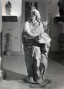 Figura maschile stante con lunghi capelli in atto di scrivere su un libro aperto sorretto da una figura angelica. Nella mano destra stringe uno stilo.
