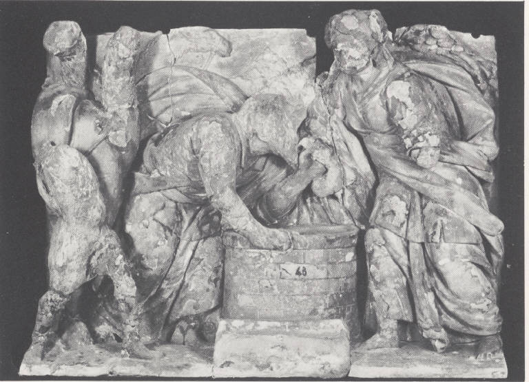 rilievo rappresentante Rebecca al pozzo. a destra della rappresentazione c'è la figura femminile di Rebecca stante, elegantemente acconciata e abbigliata, scalza, che tiene tra le mani una brocca ed è rappresentata nell'atto di abbeverare una figura maschile barbuta. Tra i due la struttura di un pozzo. alle spalle della figura maschile un fanciullo e tre cammelli.