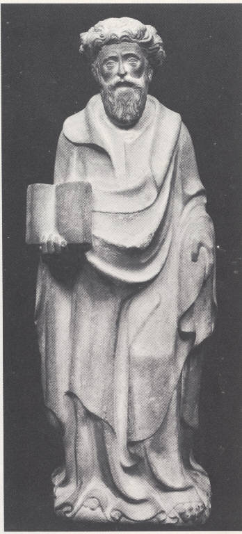 Figura maschile stante barbuta. Ammantato. Con la mano destra regge un libro chiuso.