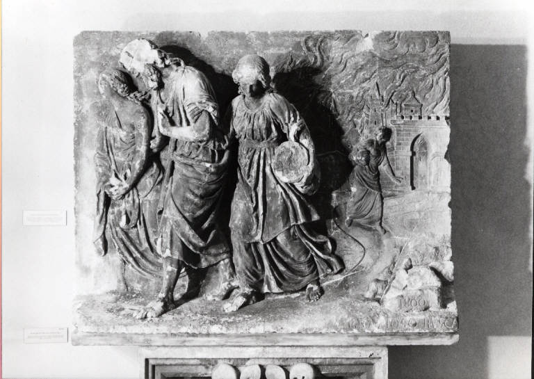 Due figure muliebri accompagnate dau uomo, barbuto fuggono dalla città in fiamme sullo sfondo.