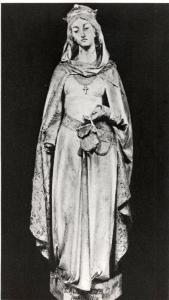 santa in abito medievale con capo velato e coronato,porta tre bisacce nella mano sinistra.