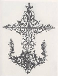 Crocefissoco i bracci immersi in una fitta rete di fogliame, in basos ai piedi di cristo, santo papa ina ginocchio, a i lati statuette di David e Mosè.