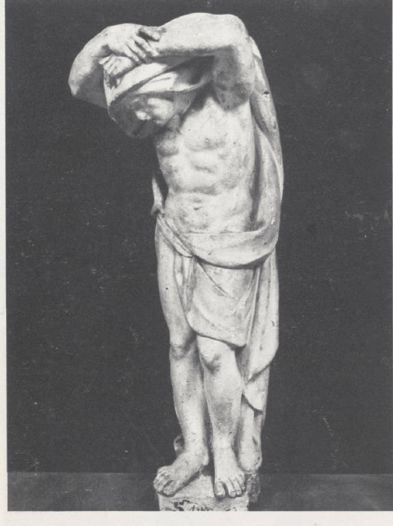 Figura virile seminuda con le braccia sollevate sopra la testa.