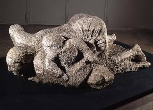 Raffigura una donna accovacciata in atto di bere, stringendo un bambino al fianco destro. La scultura appoggia su un basamento di metallo.