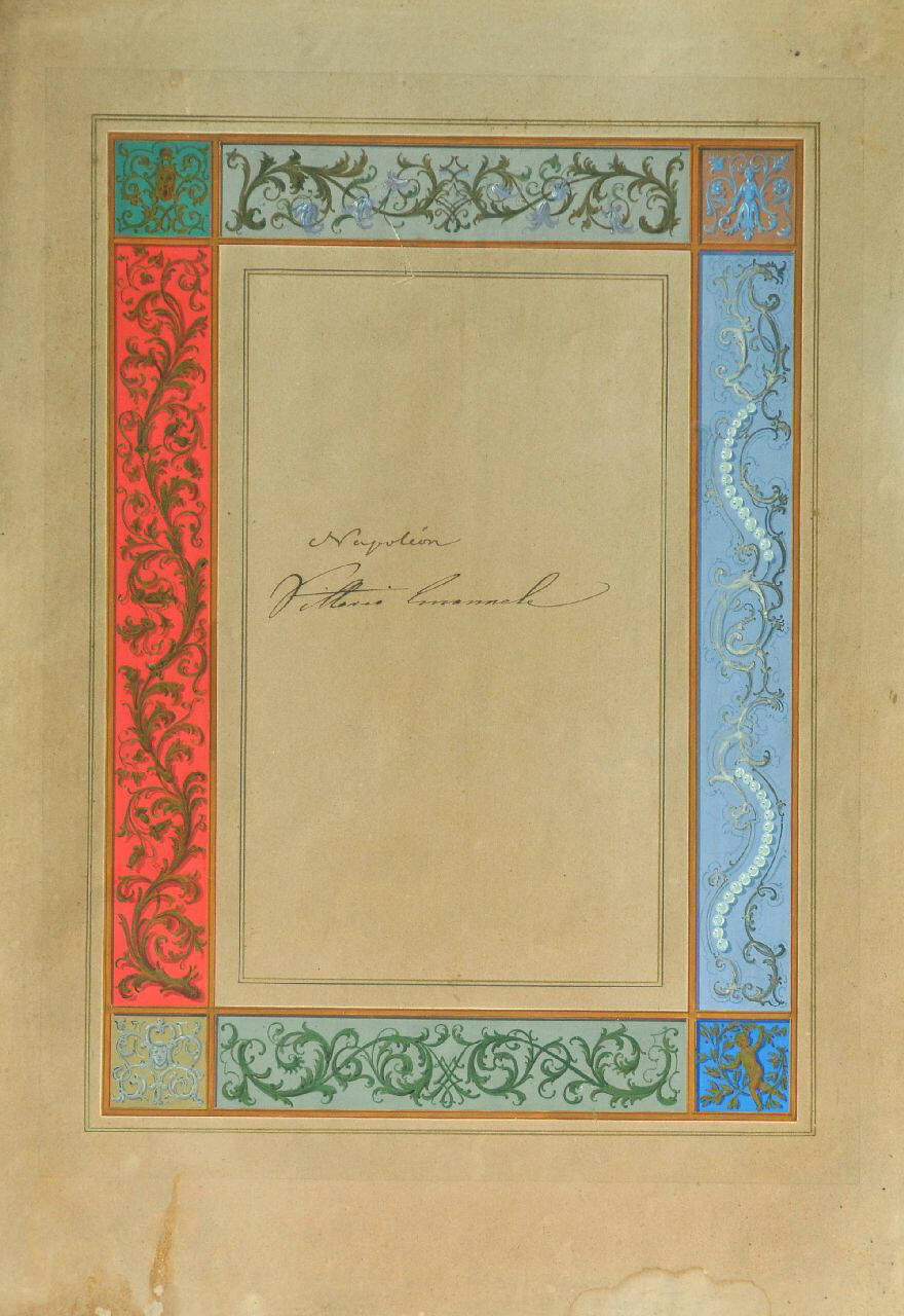 Foglio evidentemente staccato da un album. Le firme sono inquadrate entro cornice dipinta a tempera recante tralci fogliati su sfondi di colore diverso: acquamarina per i fregi inferiore e superiore; arancione per il fregio a sinistra; indaco per il fregio a destra. In quest'ultimo lato, il tralcio assume un disegno a volute accompagnato da perle inanellate. Ai quattro angoli, al centro dei motivi decorativi fogliati, dall'angolo in alto a sinistra in senso orario rispettivamente: un mascherone; figura a mezzobusto; un amorino; un mascherone.