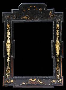 Cornice sagomata, smaltata con colore nero; candelabre decorative a panoplie e tralci vegetali lungo i lati lunghi, e a soli tralci vegetali a volute lungo i lati brevi. All'interno, cornicetta in parte renitegrata.
