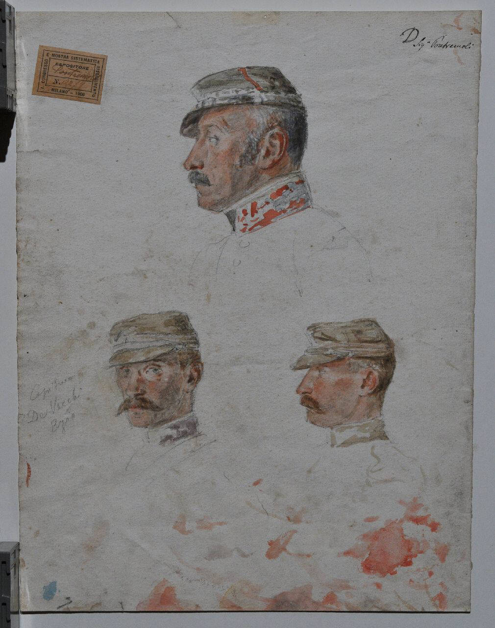 - NOTIZIE STORICO CRITICHE Probabilmente i due ritratti inferiori sono da riferirsi alla medesima persona, con tutta probabilità il Capitano Ezio De Vecchi. Si tratta di schizzi dal vero eseguiti da Pontremoli probabilmente nel corso delle battaglie di Solferino e San Martino. L'iscrizione relativa ad una "signora Pontremoli" consente di avanzare l'ipotesi che vede nella moglie dell'artista la probabile donatrice o comunque la prima provenienza del disegno.