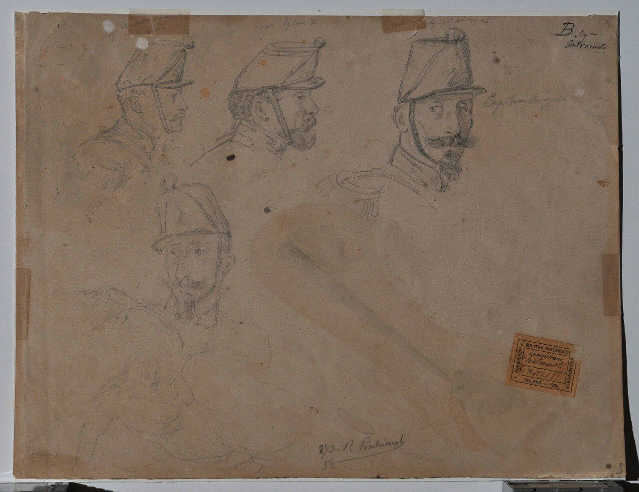 - NOTIZIE STORICO CRITICHE Probabilmente il terzo ed il quarto ritratto sono da riferirsi alla medesima persona, vista la somiglianza fisiognomica, e cioè il Capitano Conte Avogadro. Si tratta di schizzi dal vero eseguiti da Pontremoli probabilmente nel corso delle battaglie di Solferino e San Martino. L'iscrizione relativa ad una "signora Pontremoli" consente di avanzare l'ipotesi che vede nella moglie dell'artista la probabile donatrice o comunque la prima provenienza del disegno.