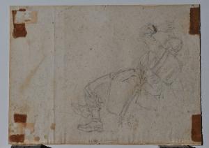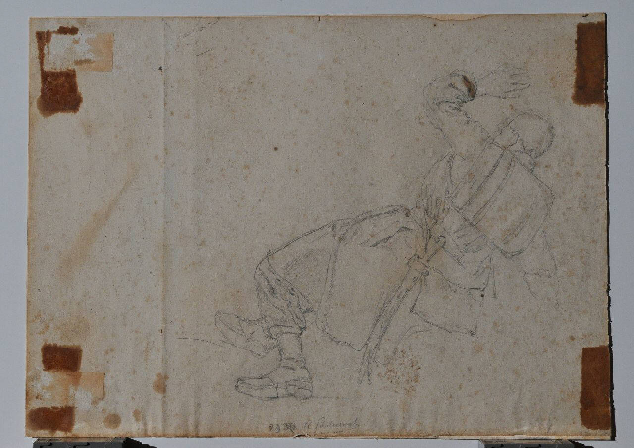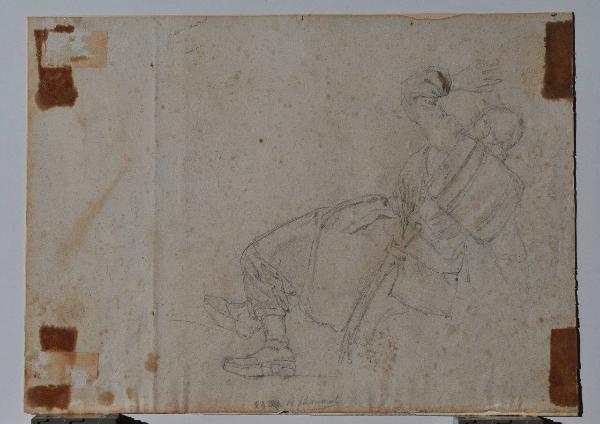 Incollato su supporto secondario in cartoncino con colla lungo i margini sinistro e destro e agli angoli. Sul verso: bozzetto a carboncino raffigurante un soldato che tiene uno stendardo.