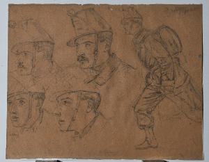- NOTIZIE STORICO CRITICHE Si tratta di schizzi dal vero eseguiti da Pontremoli al tempo delle battaglie di Solferino e San Martino, che ritrae i volti di due soldati francesi, ciascuno dei quali viene ritratto due volte secondo angolazioni lievemente differenti, ed uno a figura intera, in posizione gradiente. Il soldato il cui ritratto è più in basso aveva probabilmente nome Zuitard, mentre quello raffigurato a figura intera doveva essere Duperet.