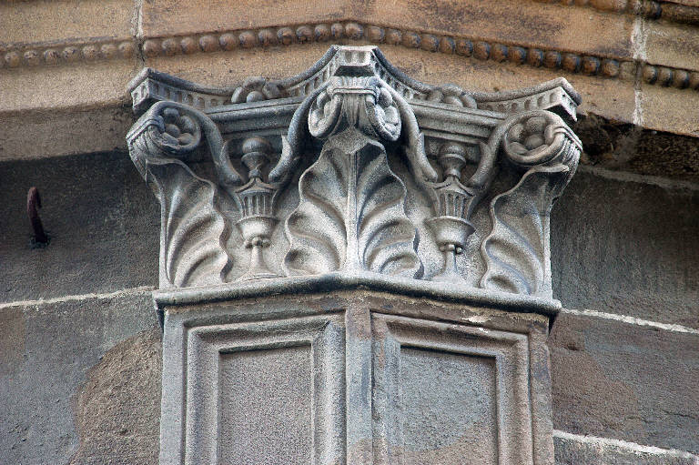 Capitello angolare di parasta in pietra arenaria scolpita; motivi decorativi a larghe foglie, volute con fiori al centro e calici.