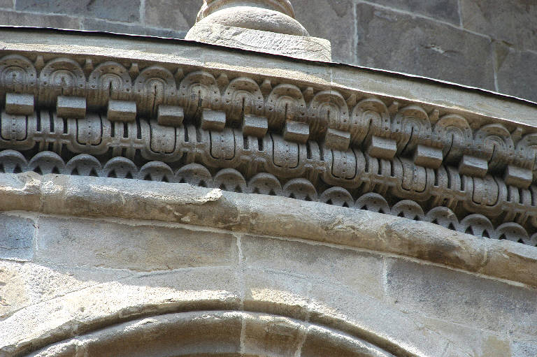 Cornice marcapiano in pietra arenaria scopita, composta da tre sequenze di motivi ornamentali: fogliette a lobo semiovale, ovoli alternati ad anelli e sormontati da dentelli, fogliette a lobo semiovale altenate a piccole punte.