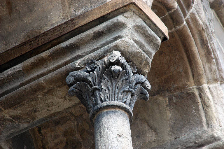 Capitello di colonna in pietra d'Angera scolpita; motivo decorativo a foglie d'acanto; al livello superiore, caulicoli fogliati.