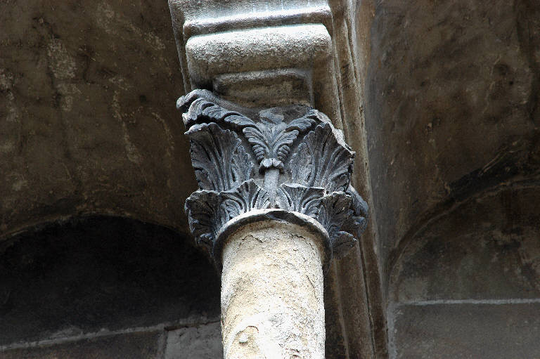 Capitello di colonna in pietra d'Angera scolpita; motivo decorativo a due ordini di foglie d'acanto; al livello superiore, caulicoli fogliati.