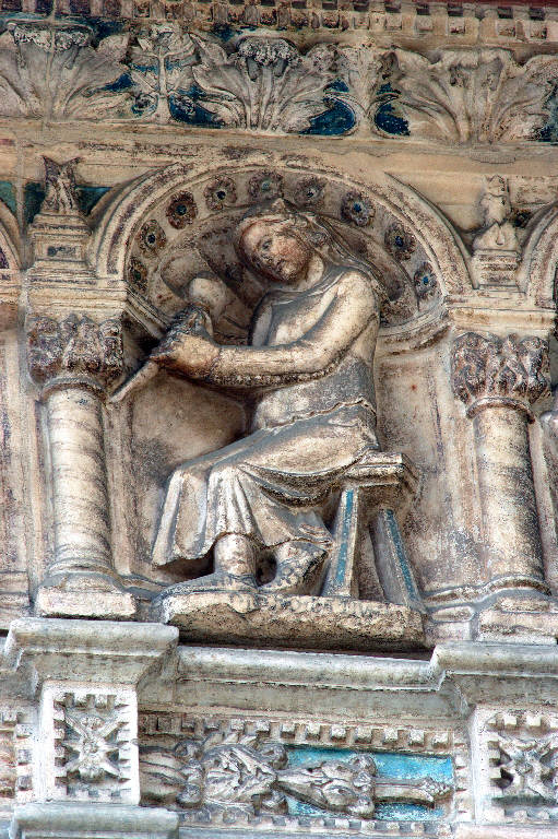 - NOTIZIE STORICO CRITICHE Il rilievo raffigura uno dei "Quattro Santi Coronati", protettori dei lapicidi; come tutte le sculture del fregio posto sull'attico, è stato riferito da Costantino Baroni ad Andreolo de' Bianchi, orafo e scultore noto per la elegante croce prcessionale ornata di formelle a sbalzo eseguita nel 1392 per il tesoro della Basilica, e rubata diversi anni fa; ma l'assenza di opere certe di riferimento, nel catalogo dell'artista, non consente di confermare l'ipotesi avanzata da Baroni; restano validi, di quella proposta, la datazione, attorno alla fine del XIV secolo, e l'ambito culturale in cui si muove l'anonimo autore del fregio, che è certamente lombardo, per la grazia cesellata dei sontuosi ornati collocati con minuta cura su tutta la superficie del rilievo (C. Baroni "La scultura gotica lombarda", Milano 1944, p. 130; Lomartire, 2009, p. 74).\nL'opera è stata restaurata tra il 1999 e il 2000 (Buonincontri, 2005, p. 248).