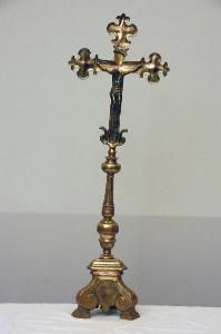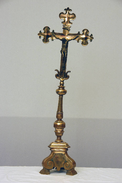 Croce d'altare con piede a tre volute e fusto a due nodi (il primo formato da due elementi accoppiati) raccordati da un elemento scanalato; croce con elementi terminali polilobati.