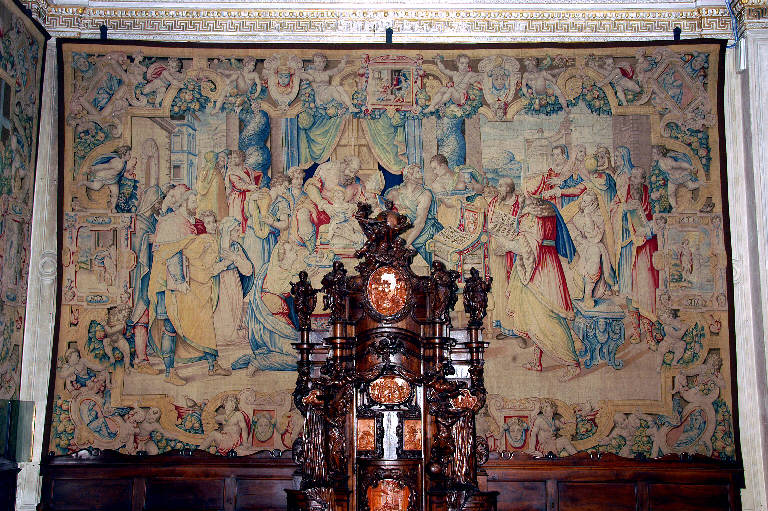 - NOTIZIE STORICO CRITICHE L'arazzo, che raffigura l'episodio della "Circoncisione di Gesù", appartiene alla serie convenzionalmente detta "fiorentina", realizzata nelle Manifatture Medicee, per incarico della MIA, tra il 1583 e il 1586 e interamente dedicata alla vita della Vergine.\nNel 1580 i deputati della Misericordia Maggiore decisero infatti di provvedere la Basilica di arazzi destinati ad ornare l'edificio nelle occasioni solenni, risparmiando così le cifre ingenti che si spendevano per gli apparati effimeri: per il tramite di Girolamo Biffi, uomo d'affari bergamasco d'origine ma da anni residente a Firenze, si presero dunque contatti con il Granduca di Toscana, per ottenere i permessi necessari, e con l'Arazzeria Medicea per l'esecuzione; i cartoni furono affidati ad Alessandro Allori e alla sua bottega, la tessitura a Benedetto Squilli di Michele (Meli, 1962, pp. 24-37). Gli arazzi giunsero a Bergamo in tre consegne successive: nel 1583 la "Natività", l'"Adorazione dei Magi" e la "Fuga in Egitto", tra il 1584 e il 1585 l'"Annunciazione", lo "Sposalizio della Vergine", la "Visitazione", la "Circoncisione" e l'"Assunzione della Vergine"; infine, nel 1586, la "Presentazione della Vergine al tempio" (Meli, cit.). \nL'opera ha subito un complesso intervento di restauro tra il 1998 e il 1999, curato da Annamaria Morassutti (cfr. pratica n. 5929, cart. 96, Archivio Congregazione Misericordia Maggiore, Bergamo).