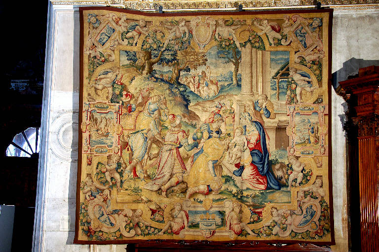 - NOTIZIE STORICO CRITICHE L'arazzo, che raffigura l'episodio della "Adorazione dei Magi", appartiene alla serie convenzionalmente detta "fiorentina", realizzata nelle Manifatture Medicee, per incarico della MIA, tra il 1583 e il 1586 e interamente dedicata alla vita della Vergine.\nNel 1580 i deputati della Misericordia Maggiore decisero infatti di provvedere la Basilica di arazzi destinati ad ornare l'edificio nelle occasioni solenni, risparmiando così le cifre ingenti che si spendevano per gli apparati effimeri: per il tramite di Girolamo Biffi, uomo d'affari bergamasco d'origine ma da anni residente a Firenze, si presero dunque contatti con il Granduca di Toscana, per ottenere i permessi necessari, e con l'Arazzeria Medicea per l'esecuzione; i cartoni furono affidati ad Alessandro Allori e alla sua bottega, la tessitura a Benedetto Squilli di Michele (Meli, 1962, pp. 24-37). Gli arazzi giunsero a Bergamo in tre consegne successive: nel 1583 la "Natività", l'"Adorazione dei Magi" e la "Fuga in Egitto", tra il 1584 e il 1585 l'"Annunciazione", lo "Sposalizio della Vergine", la "Visitazione", la "Circoncisione" e l'"Assunzione della Vergine"; infine, nel 1586, la "Presentazione della Vergine al tempio" (Meli, cit.). \nL'opera ha subito un complesso intervento di restauro tra il 2001 e il 2002, curato da Annamaria Morassutti (cfr. doc. in data 3 febbraio 2003, prot. 350, cat. 5, clas. 7, fasc. 4, Archivio Congregazione Misericordia Maggiore, Bergamo).