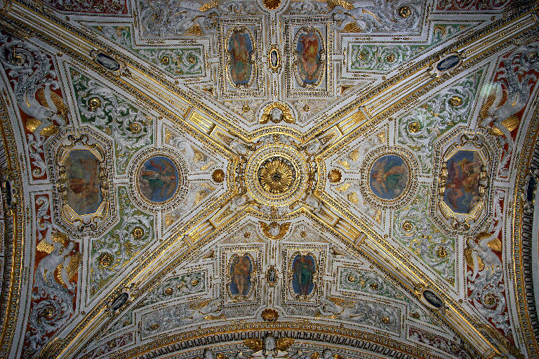 Decorazione della volta a crociera, divisa in quattro vele da fasce che s'incontrano in un rosone centrale; all'interno delle vele, piccoli affreschi che raffigurano angeli entro cornici di diverse forme, alternati a mtoivi decorativi a girali, angioletti in forma di cariatide, testine d'angelo, grandi figure fatastiche di sirene.
