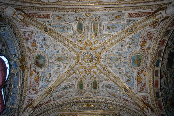 Decorazione della volta a crociera, divisa in quattro vele da fasce che s'incontrano in un rosone centrale ornato da testine d'angelo; all'interno delle vele, piccoli affreschi che raffigurano due episodi della vita di David, angeli e figurette forse di Virtù entro cornici di diverse forme, alternati a mtoivi decorativi a girali, angioletti in forma di cariatide, testine d'angelo, grandi figure fatastiche di sirene.