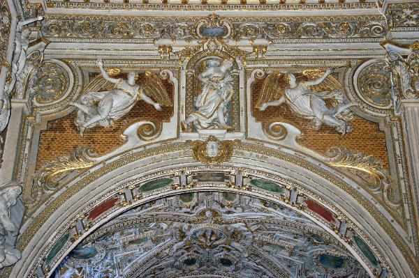 Decorazione plastica dello spazio sopra l'arco: al centro, entro nicchia, figura d'angelo stante che regge la corona di spine; a sinistra, angelo in volo; a destra angelo musicante in volo; motivi decorativi a volute e a girali.