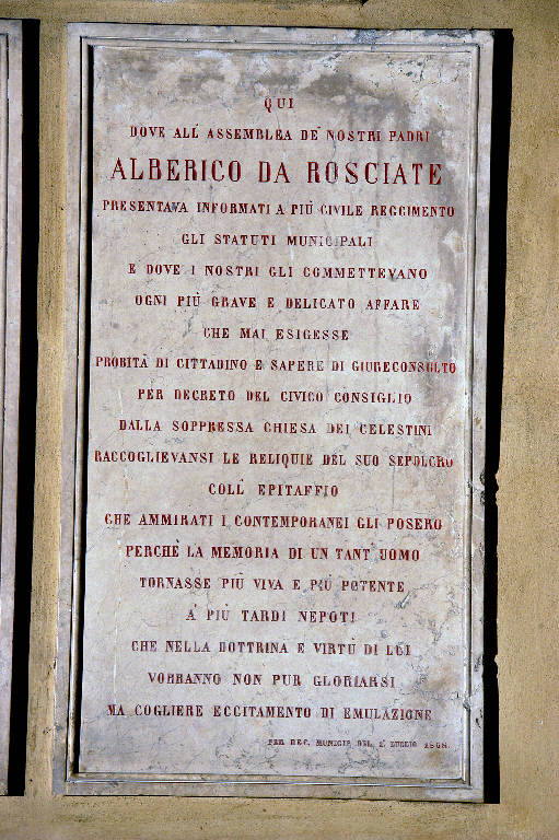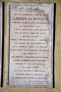 - NOTIZIE STORICO CRITICHE La lapide ricorda la decisione presa nel 1868 dal Consiglio cittadino di Bergamo: si stabilì di trasferire nella Basilica di Santa Maria Maggiore i resti del sepolcro di Alberico da Roxiate e la lapide con l'epitaffio funebre, posti un tempo nel monastero dei Celestini per celebrare degnamente la memoria del nobile giureconsulto.