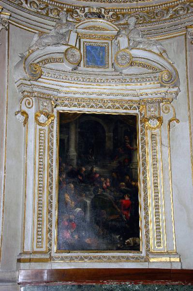 - NOTIZIE STORICO CRITICHE L'ancona fu realizzata da Francesco e Lorenzo Porta, stuccatori originari di Osteno, sul lago di Lugano, nel 1584: nei patti firmati con i deputati della Misericordia Maggiore il 23 febbraio di quell'anno, i Porta si impegnarono a seguire, per l'intera decorazione della cappella del SS. Sacramento, "...il modello fatto per ms Martin Basso e Franc. Brembilla". Con ogni probabilità, il lavoro fu eseguito in gran parte dal solo Lorenzo Porta: il nome di Francesco, infatti, scompare già a partire dal primo pagamento, datato 4 giugno 1584 (Cortesi Bosco, in "I pittori bergamaschi...Il Seicento", vol. II, pp. 92-94, nota 5).