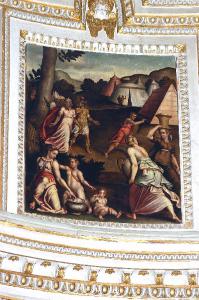 - NOTIZIE STORICO CRITICHE I dipinto, eseguito da Giovan Paolo Lolmo tra il 1584 e il 1585, narra il celebre episodio biblico della "Caduta della manna" (Esodo 16, 10-15): durante il lungo cammino nel deserto, il popolo ebraico, stanco e sofferente per le privazioni, si rivolta contro Mosè e Aronne; Dio dice a Mosè di annunciare che il Signore avrebbe provveduto al suo popolo; la mattina successiva, intorno all'accampamento, si trovano sparsi chicchi di grano che hanno il sapore di pane al miele, la manna appunto, e Mosè ordina di raccoglierla in brocche. \nIl 15 settembre 1584 il pittore bergamasco Giovan Paolo Lolmo firmò, con i deputati della Misericordia Maggiore, il contratto che lo impegnava a realizzare il quadro con la scena delle raccolta della manna, da collocare sopra la pala d'altare delle cappella del SS. Sacramento; il lavoro gli fu saldato l'8 maggio 1585, con un pagamento di £ 131 che comprendeva anche "li due quadri piccoli", la "Fede", cioè, e la "Preghiera" realizzati per la stessa cappella, ma non nominati nel contratto iniziale (Ciardi Dupré, in "I pittori bergamaschi...Il Cinquecento", vol. IV, p. 17 e p. 31, scheda 8).\nL'opera è stata restaurata nel 1960 da Franco Steffanoni (cfr. "Relazione sui lavori di restauro eseguiti ai dipinti della Basilica di Santa Maria Maggiore per incarico dell'E.C.A. di Bergamo", 24 maggio 1961, protoc. 1232, cat. 5, clas. 6, fasc. 17, Archivio Congregazione Misericordia Maggiore, Bergamo).