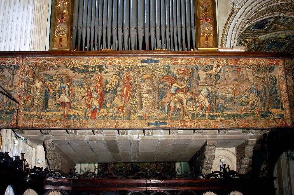 - NOTIZIE STORICO CRITICHE L'arazzo appartiene ad una serie di cinque, tutti dedicati al racconto, per episodi, di un lungo corteo trionfale di soldati romani e chiamati convenzionalmente, per questo, "arazzi del Trionfo di Vespasiano". \nL'opera, che proviene probabilmente da una manifattura di Bruxelles attiva sulla metà del XVI secolo, fu acquistata dai deputati della Misericordia Maggiore forse nel 1627: i libri contabili della MIA registrano infatti, alla data del 23 agosto di quell'anno, una nota che concede ai deputati "libertà ...di comperar quattro pezzi di Razzi historiati con figure grandi...per guarnir le cantorie della chiesa di Santa Maria", che la letteratura critica identifica, solitamente, con gli arazzi del "Trionfo" (Meli, 1962, p. 14 e pp. 16-18; Zanchi, 2003, pp. 349-350).