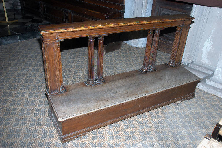 Inginocchiatoio in legno di noce: parapetto a tre aperture, delimitato ai lati da due pilastrini affiancati da colonnine scanalate d'ordine dorico; due coppie delle stesse colonnine dividono le aperture; piano superiore d'appoggio liscio, appena sporgente.