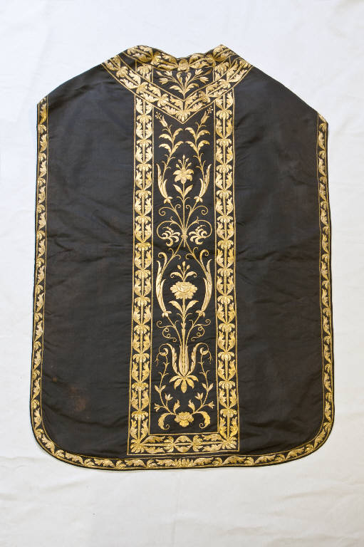 - NOTIZIE STORICO CRITICHE La pianeta in esame, appartenente ad un paramento liturgico (num. foto 1308), è realizzata in cannellato nero. Tale colore, riconducibile al dolore e al lutto, veniva usato, dopo la riforma operata da Pio V, nelle celebrazioni funebri e di suffragio del Venerdì Santo. Oggi, nelle celebrazioni delle esequie e nella commemorazione dei defunti, viene preferito il viola, mentre il Venerdì Santo viene usato il rosso. Il ricamo, eseguito in oro filato e oro laminato, presenta una decorazione di chiara ascendenza francese molto in voga nel XIX secolo. Questa moda, diffusa anche in Italia, vedeva la presenza di molti elementi decorativi desunti dal repertorio classico quali l'acanto, le volute, i tralci fioriti, uniti ad altri proprii del gusto rocaille. In alcuni casi, oltre ad elementi vegetali, si potevano trovare vasi a decori geometrici ricolmi di fiori ed eleganti anfore ansate. L'eleganza e la varietà del disegno in esame suggeriscono una realizzazione presso un laboratorio italiano di ampio respiro.