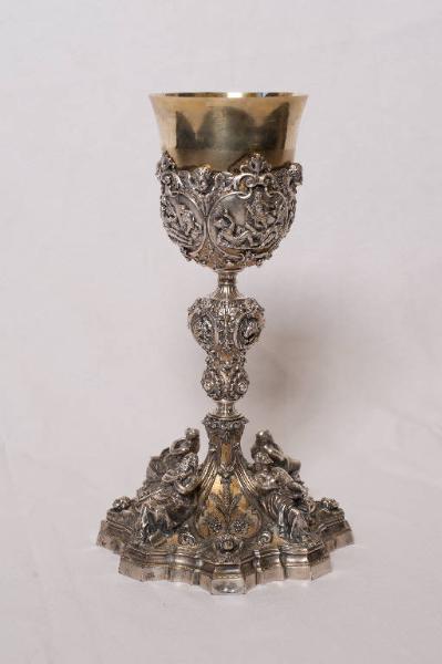 Calice in argento con base mistilinea partita in quattro facce dorate decorate da teste di cherubino, volute, spighe e tralci vitinei. Sugli assi di congiunzione sono applicate le figure dei quattro Evangelisti (Marco, Matteo, Luca e Giovanni) realizzate a fusione. Il fusto è risolto in un nodo piriforme centrale arricchito da valve di conchiglia, motivi vegetali e simboli degli Evangelisti (angelo, leone, bue e aquila) con collarino e nodo di raccordo argentati; il sottocoppa, lavorato a sbalzo, è costituito da medaglioni con volute arricciate con scene relative alla vita di Gesù (Nascita di Gesù, Ultima Cena, Gesù Cristo deposto dalla croce e Deposizione di Cristo) raccordate da teste di cherubino.