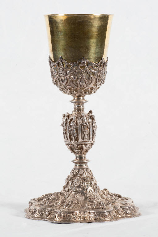 - NOTIZIE STORICO CRITICHE Il calice in esame, di buona esecuzione e di fattura elegante, presenta nella struttura e nella tipologia soluzioni stilistiche tipicamente seicentesche. Il ricco e serrato gioco decorativo, dominato da cartelle a voluta, teste di cherubino, figure, serti floreali, racemi vegetali e volute, è impostato in modo più fluido e dinamico, influenzato dall'arte barocca; anche il caratteristico nodo troncopiramidale con spigoli segnati dai quattro dottori della Chiesa entro nicche in aggetto mostra un adeguamento allo stile più aggiornato con putti in movimento e drappeggi agitati. Le cornici decorative si complicano in andamenti mistilinei e si fondono liberamente con riccioli e volute.