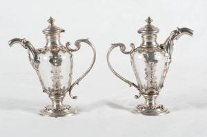 Coppia di ampolline in vetro e metallo argentato. Piede circolare con fiori stilizzati realizzati a traforo nel collo. Corpo panciuto in vetro con decori in metallo argentato; versatoio e manico a "C" con volute arricciate in metallo. Coperchio circolare attaccato all'imboccatura tramite cerniera.