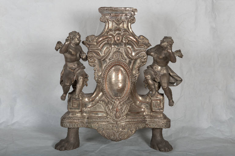 - NOTIZIE STORICO CRITICHE La base per croce d'altare in esame è realizzata in rame con parti in metallo fuso argentato. La base trapezoidale poggia a terra tramite alti piedini a zampa di leone. E' decorata a sbalzo con fregi geometrici, volute, foglie d'acanto, festoni e, al centro della specchiatura, da quello scudo ovale riproposto anche nelle terminazione dei bracci della croce processionale con cui va messa in relazione (num. foto 1118) . Al lati, sopra dei vasi di fiori poggianti su volute angolari a greca, sono fissati due angeli realizzati a fusione come i piedini. Pare plausibile una datazione alla fine del Settecento in considerazione dell'eterogeneità dei motivi decorativi, alcuni ancora legati al Rococò altri ispirati all'incipiente Neoclassicismo.