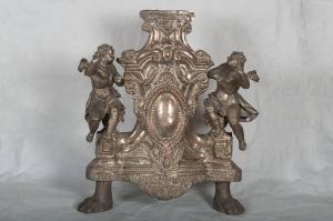 Base per croce d'altare in rame e metallo fuso argentati. Base trapezoidale con alti piedini a zampe di leone decorata con fregi geometrici, volute, foglie d'acanto, festoni e, al centro della specchiatura, con uno scudo ovale. Al lati, sopra vasi di fiori poggianti su volute angolari a meandro, sono fissati due angeli realizzati a fusione.