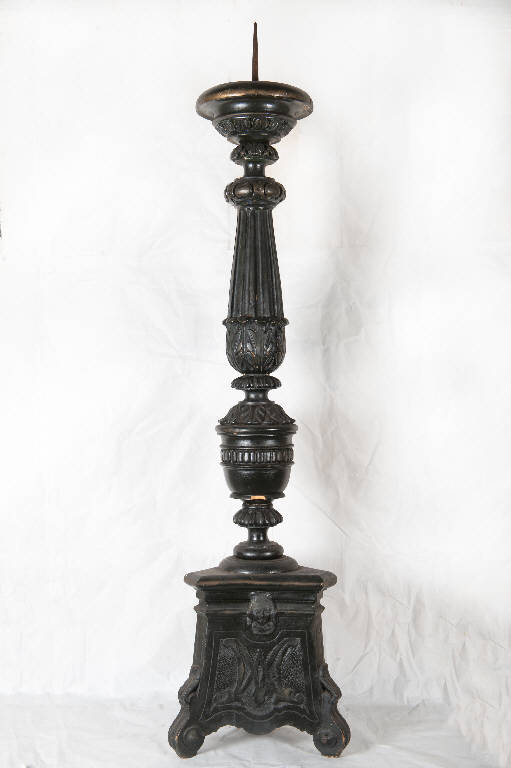- NOTIZIE STORICO CRITICHE Si tratta di candelabri in legno o ferro, solitamente molto alti, di colore nero e spesso decorati in oro, che venivano posto accanto al feretro durante la messa funebre. Non presentano caratteristiche strutturali tali da differenziarsi da candelabri comuni. La serie in esame è realizzata in legno intagliato e verniciato. I dati stilistici degli oggetti in esame, che ripropongono con una certa approssimazione forme e motivi decorativi ripresi dal repertorio settecentesco, e la loro eterogeneità, tipica dell'eclettismo, inducono ad una datazione al XIX secolo.