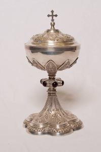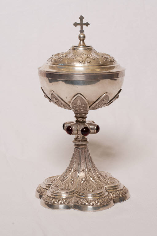 - NOTIZIE STORICO CRITICHE Si tratta di una pisside in argento con piede a base lobata decorato da motivi vegetali stilizzati. Il nodo schiacciato è caratterizzato da pietre dure incastonate. Sottocoppa e coppa sono decorati con il medesimo motivo ornamentale della base. La tipologia dell'oggetto ben esemplifica le tendenze dell'argenteria nella seconda metà dell'Ottocento caratterizzate da una ripresa neogotica. La presenza sotto il piede sia del marchio che del punzone con le iniziali del toccatore consente di rimandare la pisside all'argentiere Angelo Ghezzi e di datarla dopo il 1843, anno in cui tale punzone cominciò ad essere impresso. Fa parte di una donazione fatta da L. Fumagalli ("Inventario beni mobili", 2003).