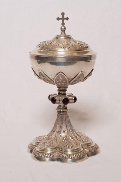 Pisside in argento. Piede lobato con motivi vegetali stilizzati. Nodo schiacciato con pietre dure incastonate. Sottocoppa e coppa decorate con motivi vegetali.