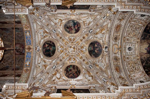 Volta a crociera della prima campata del presbiterio: lo spazio è diviso in quattro vele da fasce decorative all'interno delle quali, entro cornici ovali sormontate da figure femminili alate e sorrette da angeli, sono inseriti riquadri a olio con episodi della vita della Vergine.