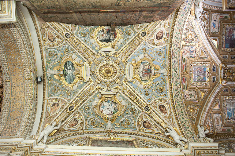 - NOTIZIE STORICO CRITICHE Nei libri contabili della Basilica non si trova alcuna menzione riguardo a questi affreschi raffiguranti episodi della vita di Gesù Cristo, eseguiti probabilmente da un decoratore specializzato attivo nella bottega di Lorenzo Porta, stuccatore originario di Osteno sul lago di Lugano che eseguì tra il 1585 e il 1587 la decorazione plastica della navatella (Cortesi Bosco, in "I pittori bergamaschi...Il Seicento", vol. II, pp. 92-94, nota 6).